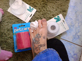 Today, I raided the dog's emergency kit to splint what I now suspect is a broken toe (or at the very least, a really, really badly sprained situation in the "This Little Piggy Had None" toe).
